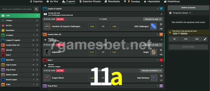 O 11a oferece uma grande seleção de opções de apostas em e-sports com probabilidades competitivas